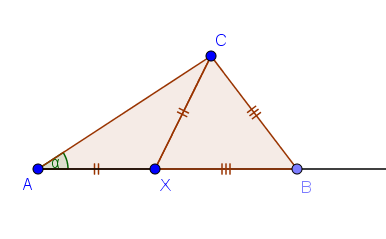 Wir tun wieder so, als hätten wir eine Zerlegung des Dreiecks ABC gefunden. Ohne Beschränkung der Allgemeinheit schneiden wir von C durch c und so, dass das Dreieck AXC stumpfwinklig ist. Der Außenwinkel ξ bei X ist (wie man leicht sieht) doppelt so groß wie der Innenwinkel α bei A.