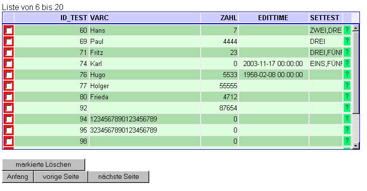 Da die Listendarstellung nur eine gute Übersicht über den Datenbestand geben soll, werde ich der Tabelle aber feste Breite (display:fixed) auf den Weg geben. Ich habe sowieso eine maximale Spaltenbreite von 30 (als Konstante für's Modul) festgelegt. Einige Textfelder sind ohnehin länger.