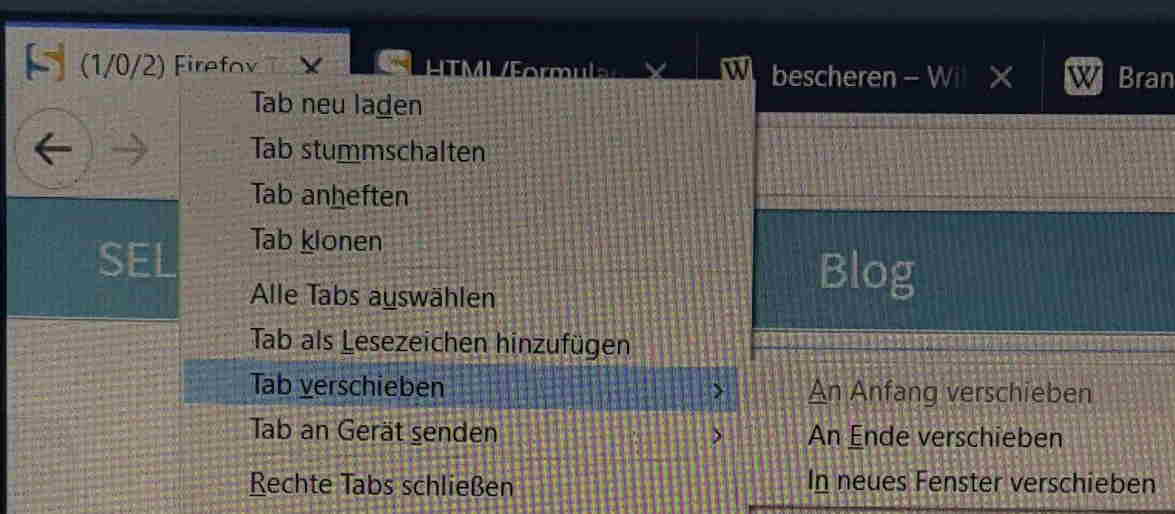 Aber wie kommst du an das Kontextmenü des Tabs, ohne die Maus zu benutzen? Das ist mir noch nicht gelungen. Mit der Kontextmenü-Taste auf einer Windows-Tastatur (alternativ geht meistens Shift-F10) bekomme ich nur das Kontextmenü der angezeigten Seite - genauer gesagt: des aktuell focussierten Elements auf der Seite.