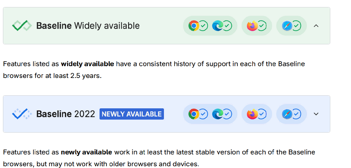 Anstatt bis zur offiziellen Zertifizierung durch das W3C zu warten, bieten MDN/Caniuse eine Baseline an, die sich an der tatsächlichen Verbreitung orientiert.